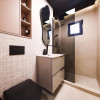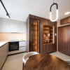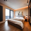 Bucătărie complet utilată (plita inducție, cuptor, hotă, frigider încorporat, mașină vase + rufe), electrocasnice Electrolux & Samsung. Baie modernă cu duș walk-in, WC suspendat și aerisire naturală.
