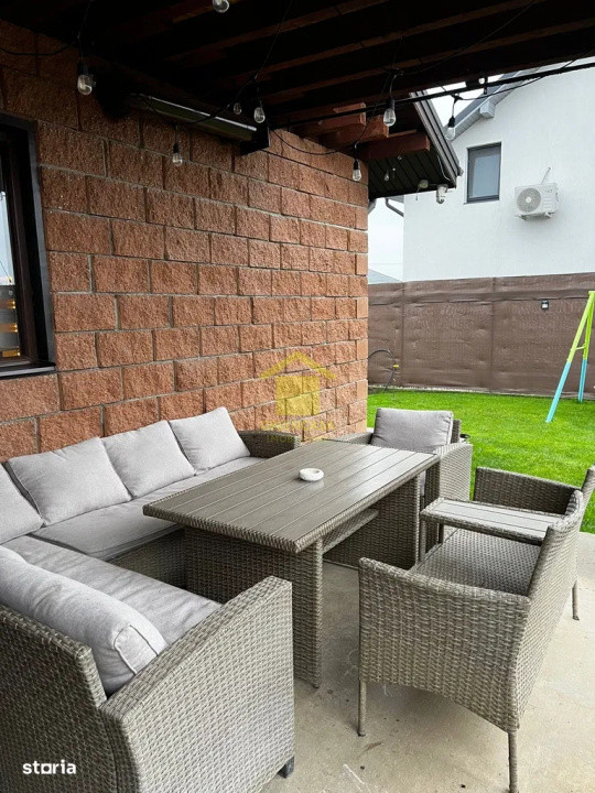 Iluminatul exterior este complet realizat, cu senzori pe casă, iluminat pe gard și în curte, plus stâlpi solari. În plus, casa beneficiază de sistem de supraveghere video și sistem automatizat de aspersoare.