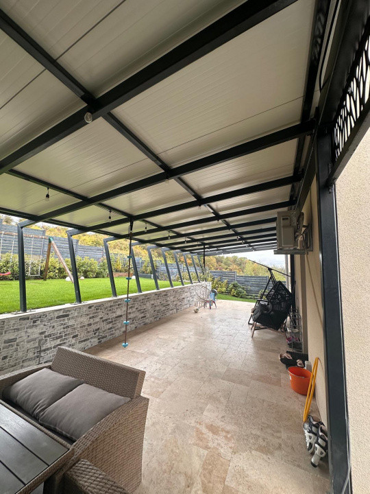 Curte: 2 locuri parcare, alei, gazon si terasa generoasa 50mp (terasa din metal zincata, acoperita cu panouri sandwich)