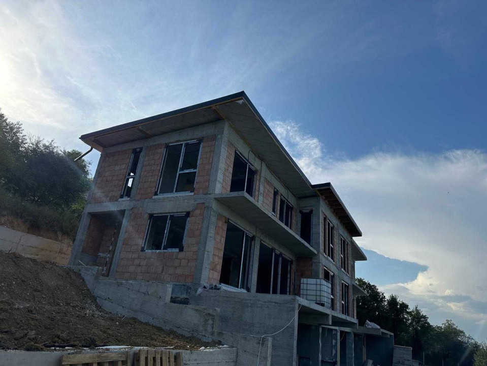 Casa este construită din cărămidă evoceramic , izolată cu polistiren de 15 cm. , finisata cu decorativa,lemn si piatra, acoperită cu tabla si izolatie de celuloza de 25 cm de cea mai buna calitate, dispune de incalzire in pardoseala rehau si geamuri termopan cu 3 sticle si profil de 86mm Salamander. Curtea este împrejmuită cu gard din beton finisat cu vopsea decorativa si tabla de culoare gri antracit (aceeasi nuanta ca si pe casa) ,fiind complet finisat, și acces auto pavat de la poartă până la intrarea in garaje.