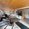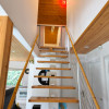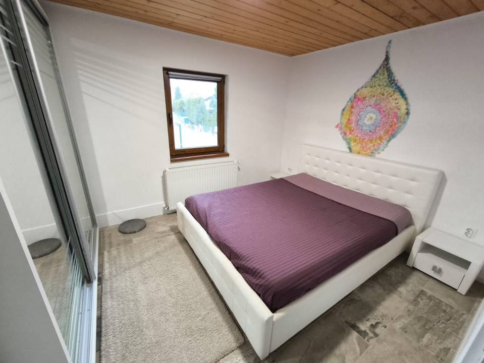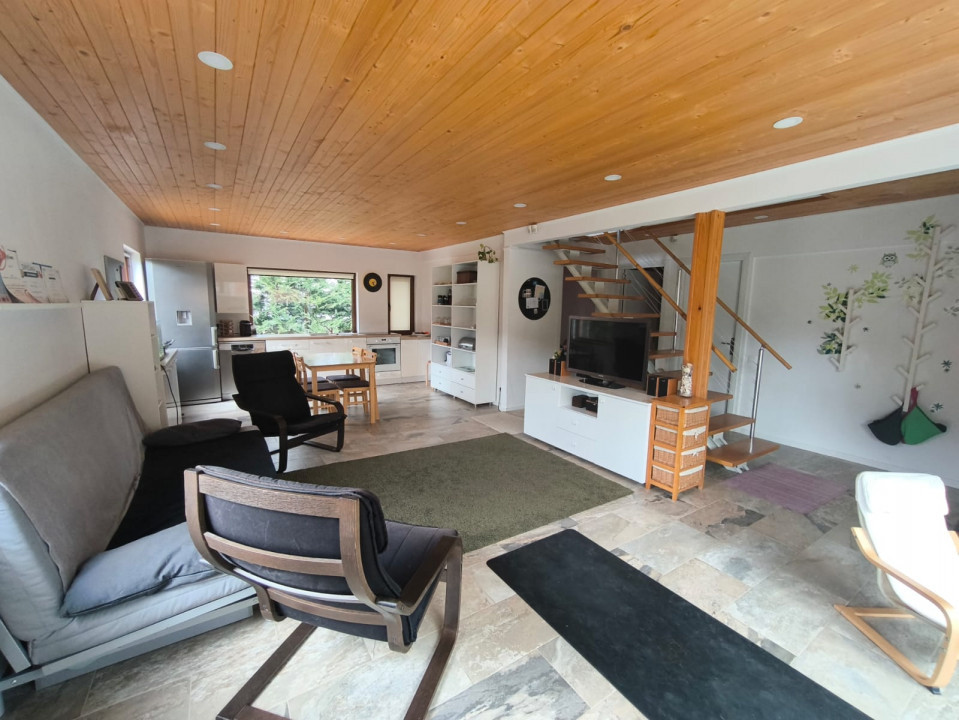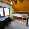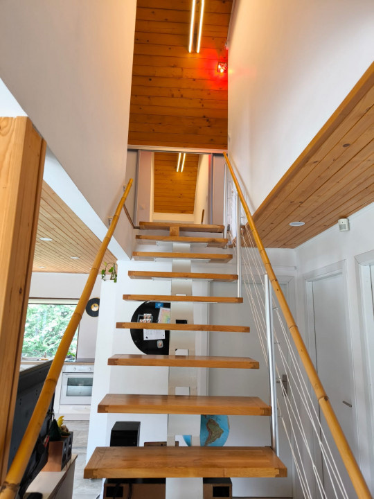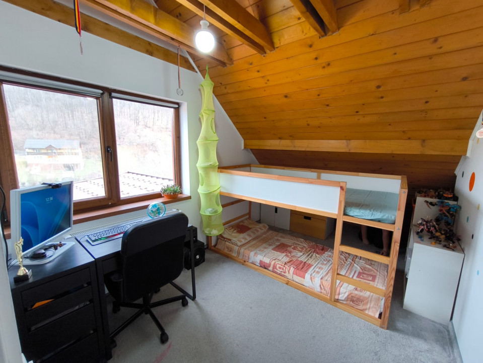 Casa are la parter living, bucatarie, dormitor si baie, iar la mansarda 2 dormitoare, birou si baie.