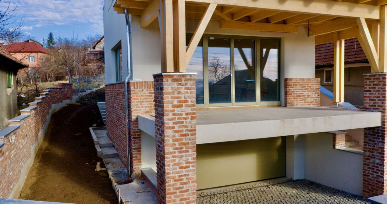 - Tamplarie din lemn stratificat cu profil Eurofalz, 90×85 mm echipat cu pachet termoizolant 48 mm - 4Lowe+18WE+4Float+18WE+4Low-e cu argon, culoare RAL 7034