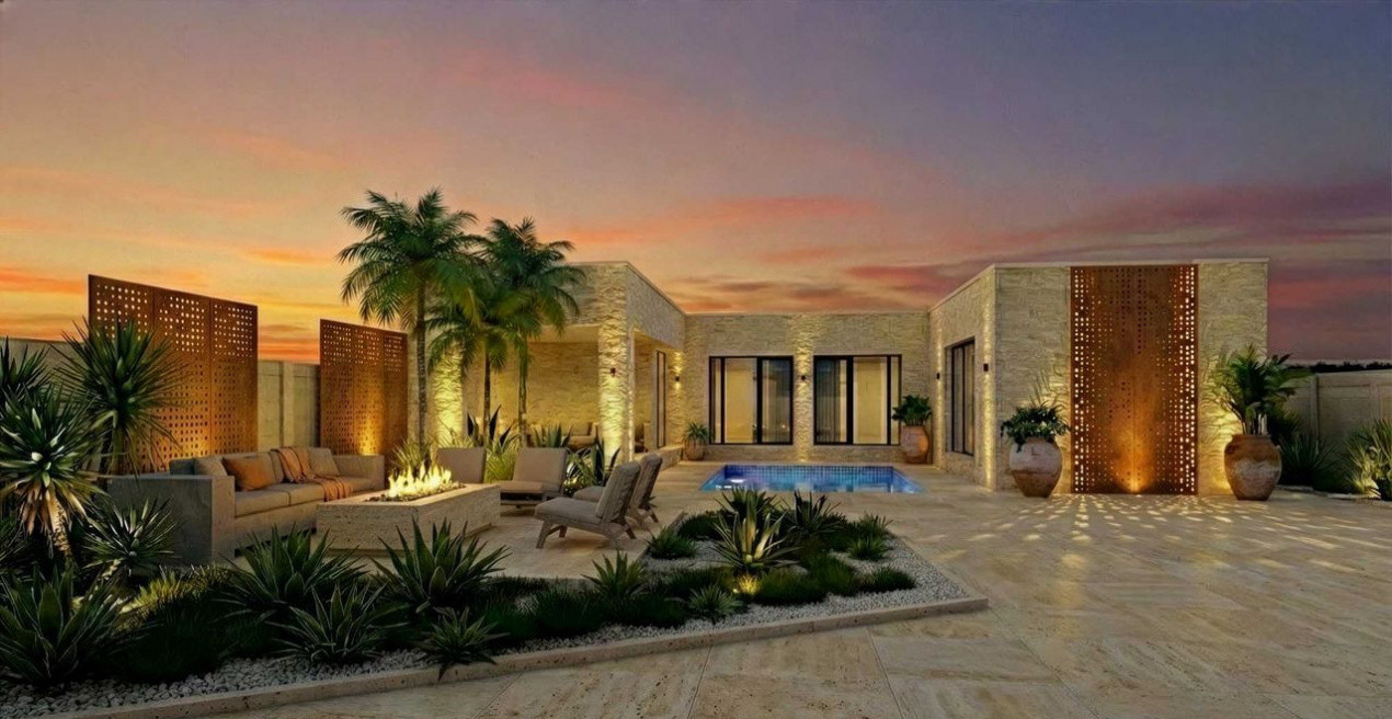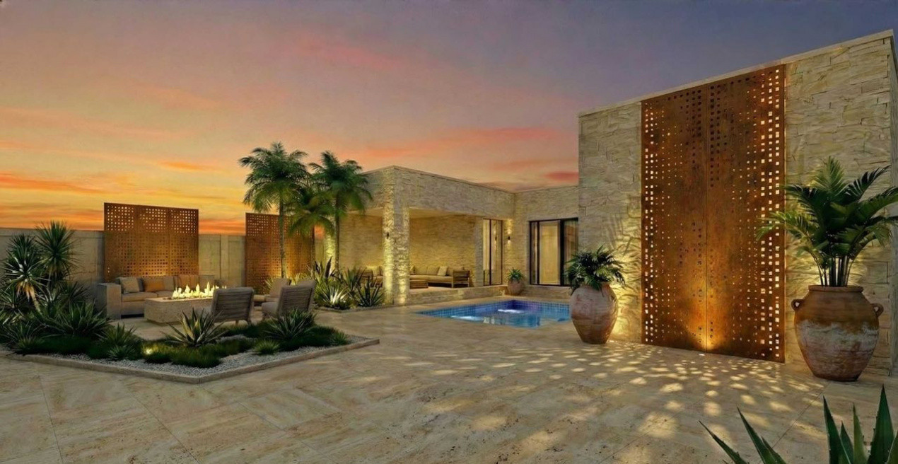 Conceptul casei pune accent pe echilibrul dintre interior și exterior. Piscina exterioară, terasa acoperită și zona de focar exterior (fire pit) creează un spațiu perfect pentru relaxare, indiferent de sezon, fără a părăsi confortul propriei locuințe.
