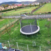 -curte frumos amenajată, cu gazon, pomi fructiferi și arbuști fructiferi