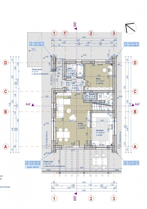 Parter: living generos open-space cu bucătăria, birou, baie
