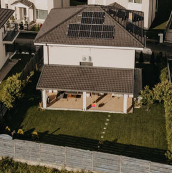 Incalzire cu centrală Vaillant, încălzire în pardoseală pe ambele nivele, automatizare Uponor cu comandă de control individual pentru fiecare cameră, aparat aer conditionat samsung, semineu pe lemne (cu ventilatie). Casa este izolată cu polistiren de 15 cm, geamuri tripan, tiglă ceramică.