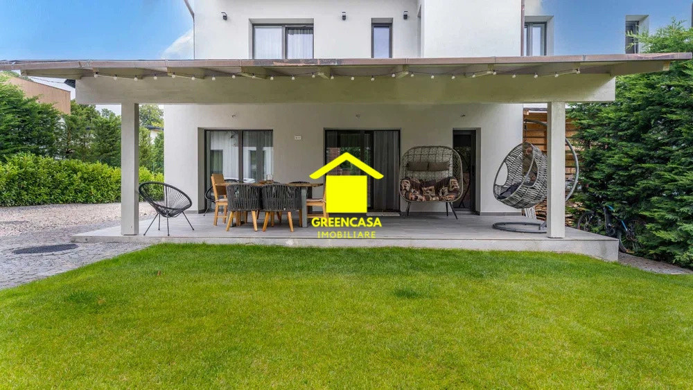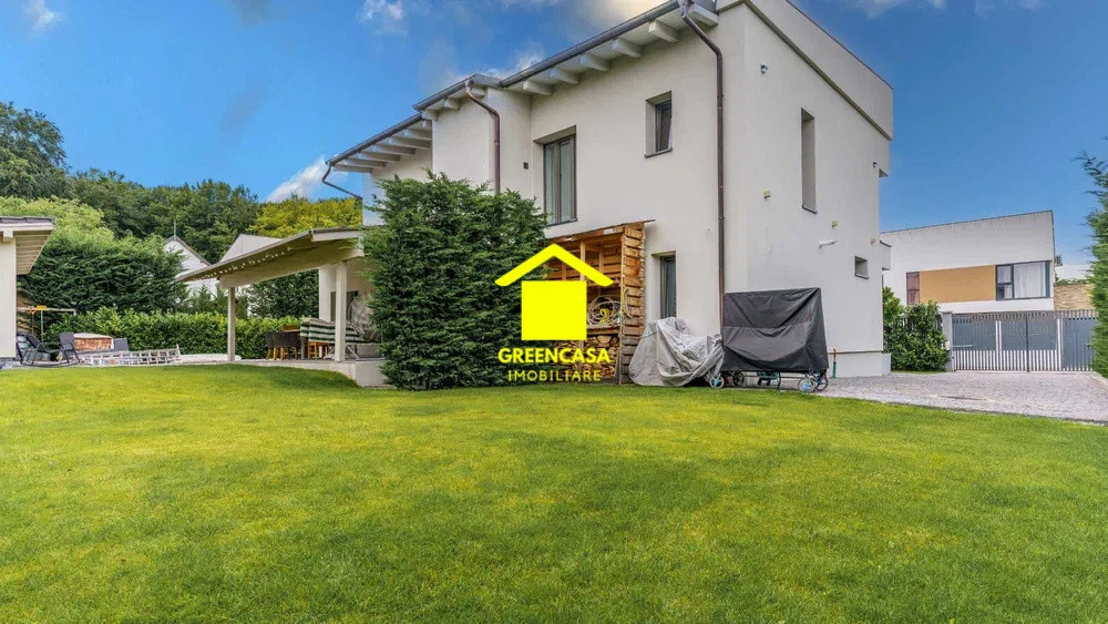 Grădina este un adevărat refugiu natural, amenajată cu gazon perfect întreținut, sistem automat de irigație conectat la bazinul de colectare a apelor pluviale, alei pavate cu piatră cubică, vegetație ornamentală și o bucătărie de vară complet utilată de 40 mp, ce include și o cameră de oaspeți. Curtea este împrejmuită cu gard din cărămidă aparentă și gard viu de brazi, asigurând intimitate și eleganță.