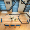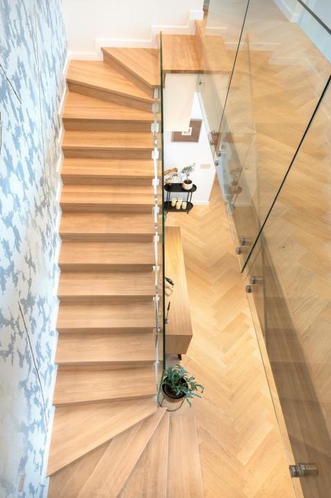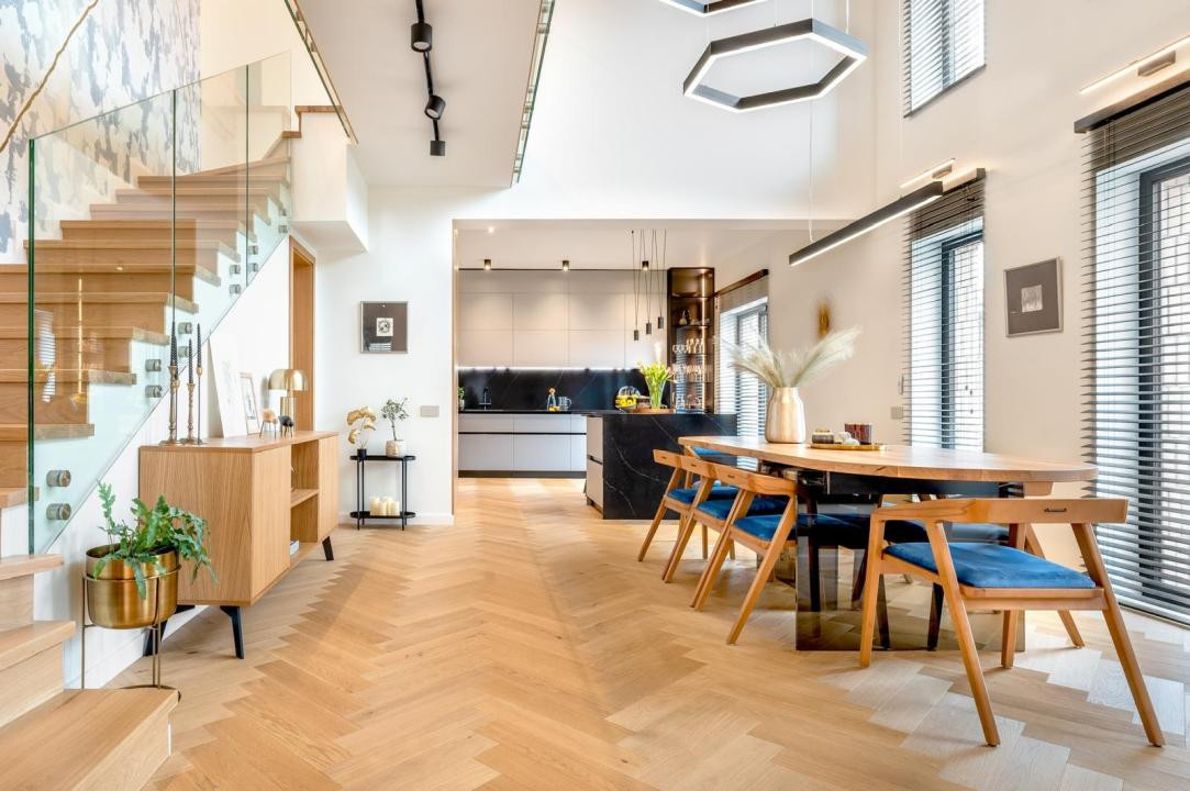 Parter: bucătărie, zona de luat masa cu înălțime liberă de 6 m, living cu șemineu pe lemne, baie de serviciu, dormitor matrimonial cu dressing și baie proprie, garaj, cameră tehnică