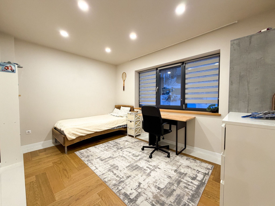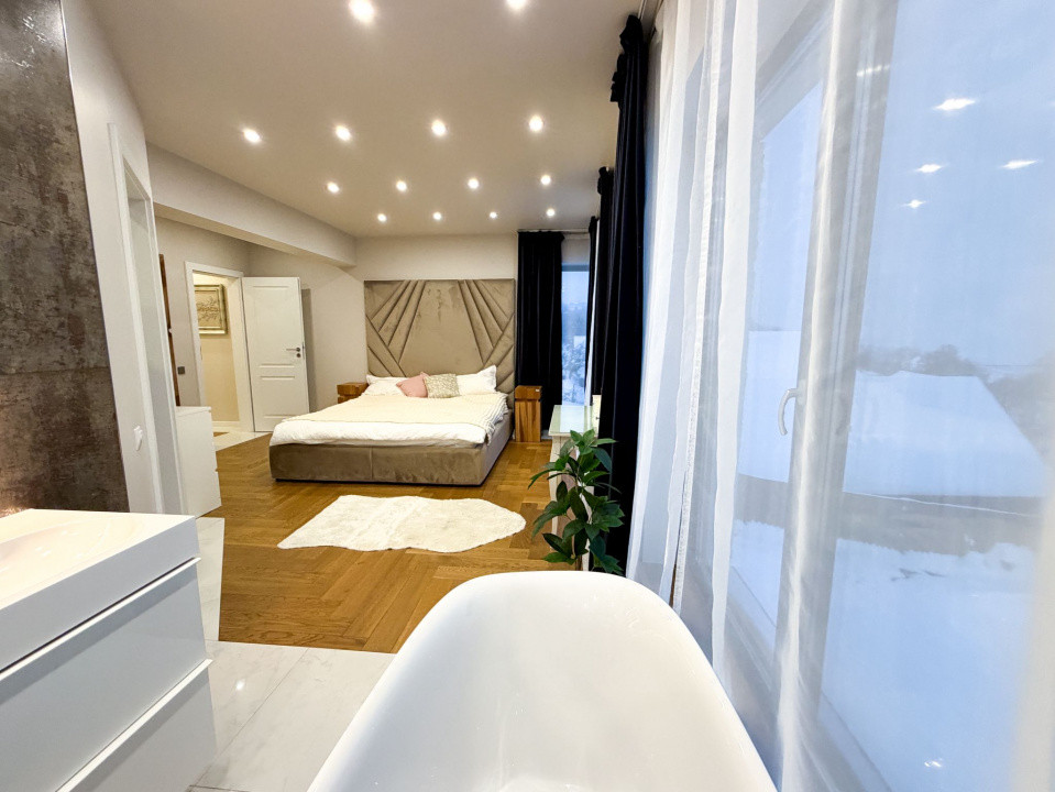 Dormitorul matrimonial pe lângă baia proprie are și un dressing generos.