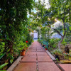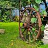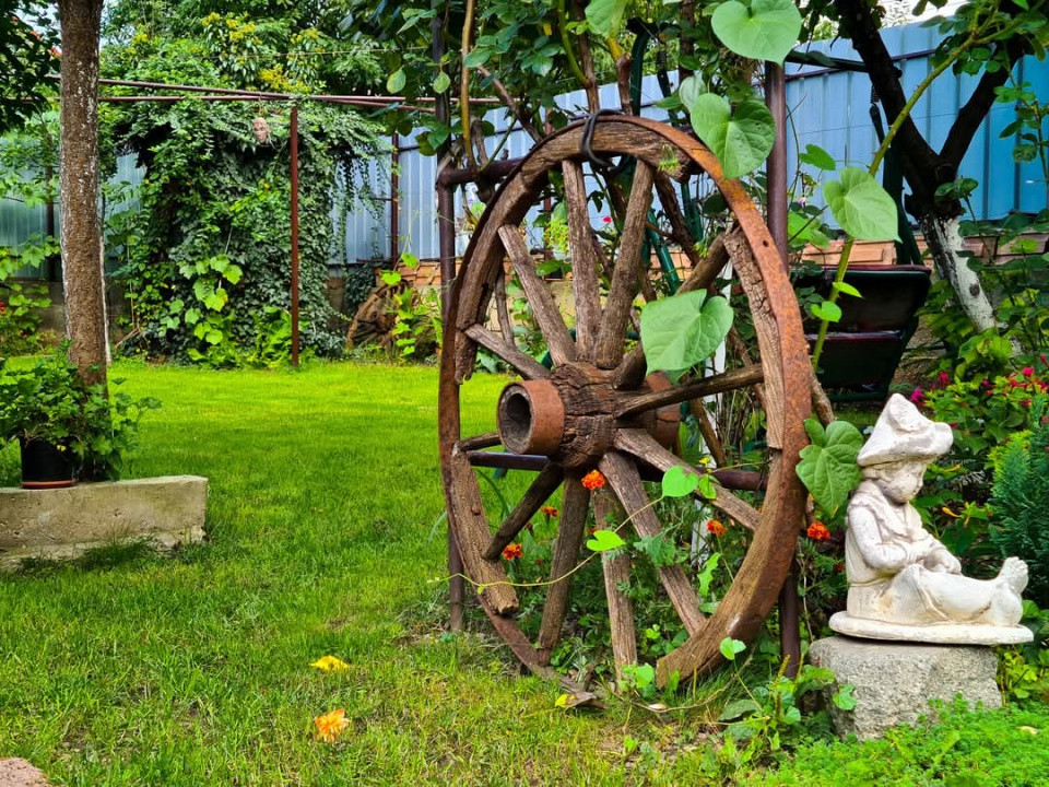 Gradină: foișor spațios, fântână, zonă cu gazon, pomi fructiferi și viță de vie