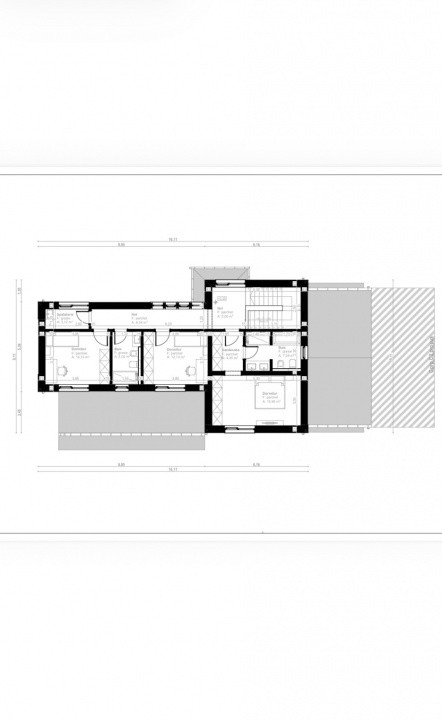 Etaj (73,3 mp): hol, dormitor matrimonial cu dressing și baie proprie, două dormitoare, baie și spălătorie